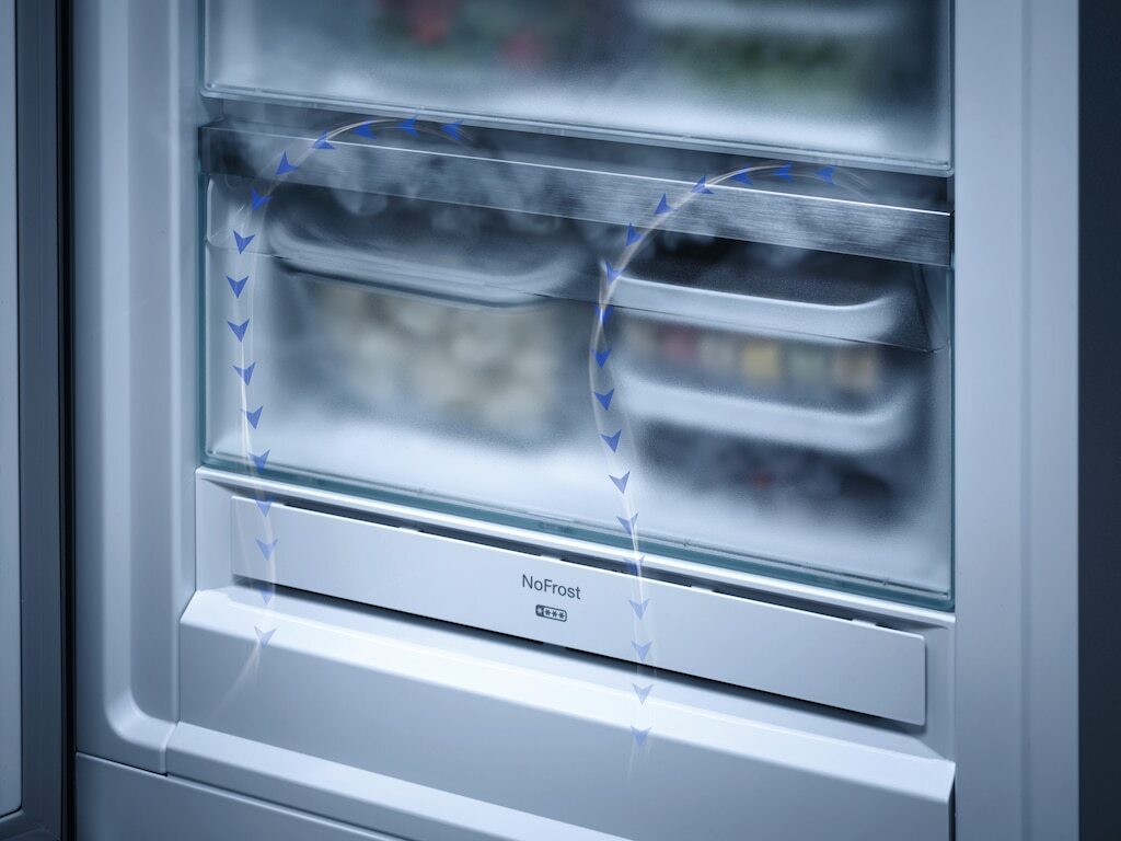 NoFrost Больше не нужно размораживать: благодаря рециркуляционному охлаждению внутри больше не образуется лед, что устраняет необходимость в размораживании.