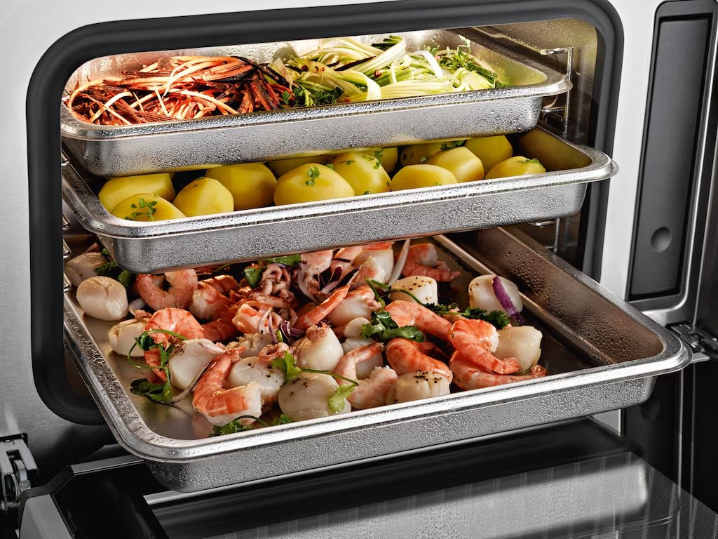 Приготовление на 3 уровнях Вы можете готовить на 3 уровнях одновременно. Каждое блюдо сохраняет свой собственный, аутентичный вкус. Камера для приготовления пищи из нержавеющей стали с льняной структурой. Высокое качество и простота очистки: все наши пароварки оснащены варочной камерой из нержавеющей стали. Прозрачная дверь Лучший обзор готовящейся пищи благодаря практичной прозрачной дверце. Большое пространство для приготовления пищи, большая площадь поверхности. Готовьте для всей семьи: камера пароварки Miele с функцией DualSteam позволяет готовить большое количество блюд одновременно и подавать их идеально приготовленными. Благодаря 40-литровой камере для приготовления пищи вы можете разместить одну большую или две меньшие емкости для приготовления пищи одну за другой на каждом из трех уровней. В комплект входят: Перфорированные контейнеры из нержавеющей стали для приготовления на пару – 2 шт Неперфорированный контейнер из нержавеющей стали (DGG 50 40) – 1 шт Подставка-решётка – 1 шт Поддон для сбора жидкости (DGG 100 40) – 1 шт Таблетки для удаления накипи – 2 упаковки