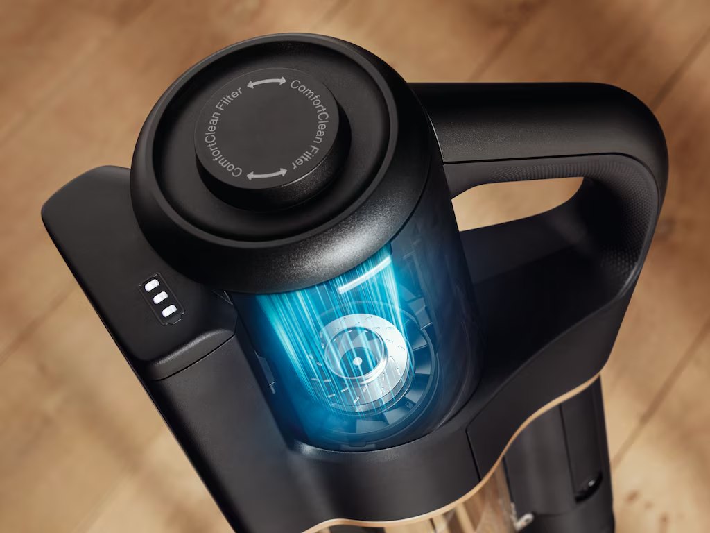 Легкая очистка Очистка пылесборника становится легкой благодаря Click2open. Просто нажмите кнопку, и содержимое контейнера опорожнится вертикально вниз в мусорное ведро. Электрическая щетка MultiFloor Для оптимальной уборки: благодаря функции распознавания напольного покрытия скорость вращения щеточного валика регулируется автоматически. Идеальный дизайн Благодаря привлекательному и современному дизайну вы можете открыто и наглядно интегрировать его в свой дом. Цифровой двигатель Digital Efficiency Motor Неизменно эффективный и мощный: благодаря нашей новейшей технологии Digital Efficiency Motor вы получаете исключительно высокую мощность всасывания при низком энергопотреблении.